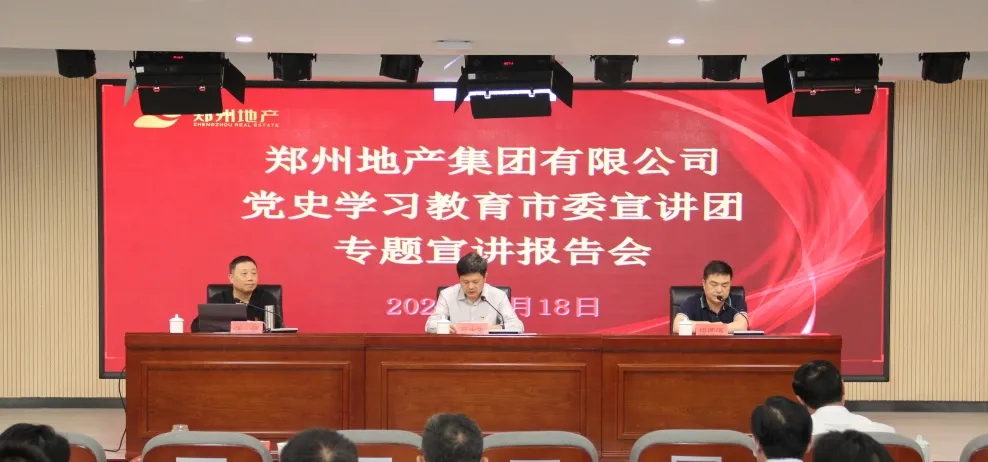 為持續(xù)推進(jìn)黨史學(xué)習(xí)教育走深走實(shí),5月18日上午,鄭州市委宣講團(tuán)走進(jìn)鄭州地產(chǎn)集團(tuán),在集團(tuán)301多功能廳開展黨史學(xué)習(xí)教育專題宣講報(bào)告會(huì)。報(bào)告會(huì)由鄭州市委宣講團(tuán)成員、鄭州工程技術(shù)學(xué)院馬克思主義學(xué)院副教授張豪主講,市國資黨史學(xué)習(xí)教育第二巡回指導(dǎo)組組長、四級(jí)調(diào)研員段德強(qiáng),指導(dǎo)組成員張?jiān)娪?、陳祥斐到?huì)巡聽旁聽,地產(chǎn)集團(tuán)領(lǐng)導(dǎo)班子、總部全體員工,各子公司支部書記、黨建部門負(fù)責(zé)人等共計(jì)150余人參加現(xiàn)場(chǎng)報(bào)告會(huì),各子公司員工共計(jì)170余人通過線上直播進(jìn)行觀看,會(huì)議由地產(chǎn)集團(tuán)黨委書記、董事長萬永生主持。