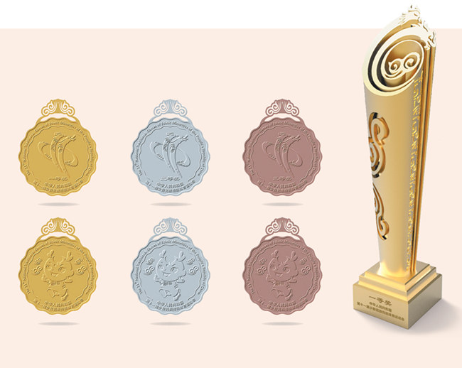獎(jiǎng)杯《龍鳳書卷》,靈動(dòng)而不失莊重。獎(jiǎng)杯上端外觀基于會(huì)徽核心圖形“龍鳳”,具有較高的辨識(shí)度。龍鳳組成“11”圖案,呈相依相伴騰飛之勢(shì),中間升騰古老的祥云圖案,彰顯中華文明生生不息的活力。獎(jiǎng)杯底座由三級(jí)臺(tái)階組成,寓意“三個(gè)離不開(kāi)”(漢族離不開(kāi)各少數(shù)民族,各少數(shù)民族離不開(kāi)漢族,各少數(shù)民族之間也互相離不開(kāi))思想和步步高的美好祝福,激勵(lì)運(yùn)動(dòng)員奮力拼搏。