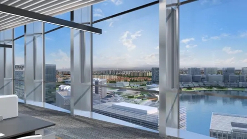 城發(fā)中心以“嵩山書頁巖”為設(shè)計理念,以中空LOW-E玻璃打造極簡幕墻立面,玻璃寬約3米,隱藏式開啟窗。