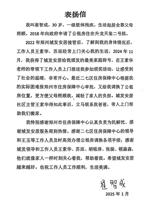 1月9日清晨,崔老師一家分別向住保中心、城發(fā)安居贈(zèng)送了錦旗,并送來一封表?yè)P(yáng)信,對(duì)住保中心所展現(xiàn)的認(rèn)真負(fù)責(zé)態(tài)度以及為民解憂的卓越作風(fēng)表達(dá)了高度贊揚(yáng),同時(shí)也對(duì)城發(fā)安居工作給予了肯定鼓勵(lì)。