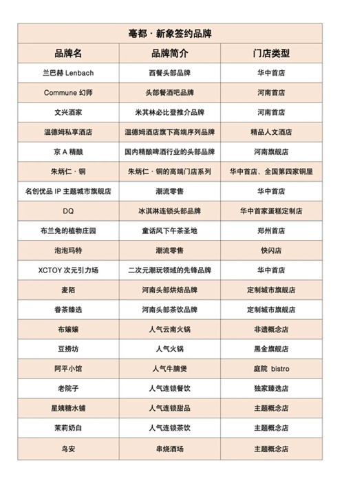 發(fā)布會(huì)上,蘭巴赫LENBACH華中首店、COMMUNE幻師河南首店、米其林必比登推薦的文興酒家河南首店、溫德姆私享酒店、京A精釀河南旗艦店、朱炳仁·銅全國第四座銅屋“中原銅屋”華中首店、名創(chuàng)優(yōu)品IP主題城市旗艦店華中首店、XCTOY次元引力場華中首店、DQ華中首家蛋糕定制門店、布蘭兔的植物莊園鄭州首店…等品牌確定進(jìn)駐項(xiàng)目,占比超30%的首進(jìn)品牌,讓亳都·新象成為鄭州首發(fā)經(jīng)濟(jì)的策源地之一。