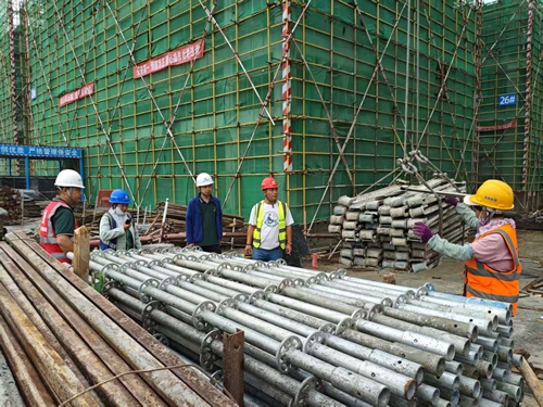 來到3樓頂板上方,工人們正搭建防護(hù)網(wǎng)。“他們是這個(gè)工作面的開荒者,危險(xiǎn)系數(shù)最大。”葉劉杰說,只有防護(hù)網(wǎng)搭建完畢,木工、鋼筋工等不同班組才能陸續(xù)入場施工。仔細(xì)查看每道工序,并對當(dāng)班工人叮囑一番注意事項(xiàng)后,葉劉杰才放心離開。
