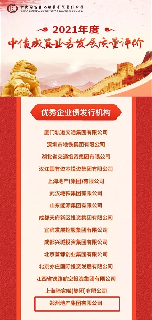 2022年1月4日,鄭州地產(chǎn)集團(tuán)獲評(píng)中央國債登記結(jié)算有限責(zé)任公司(以下簡稱中央結(jié)算公司)發(fā)布的2021年度中債成員業(yè)務(wù)發(fā)展質(zhì)量評(píng)價(jià)“優(yōu)秀企業(yè)債發(fā)行機(jī)構(gòu)”。