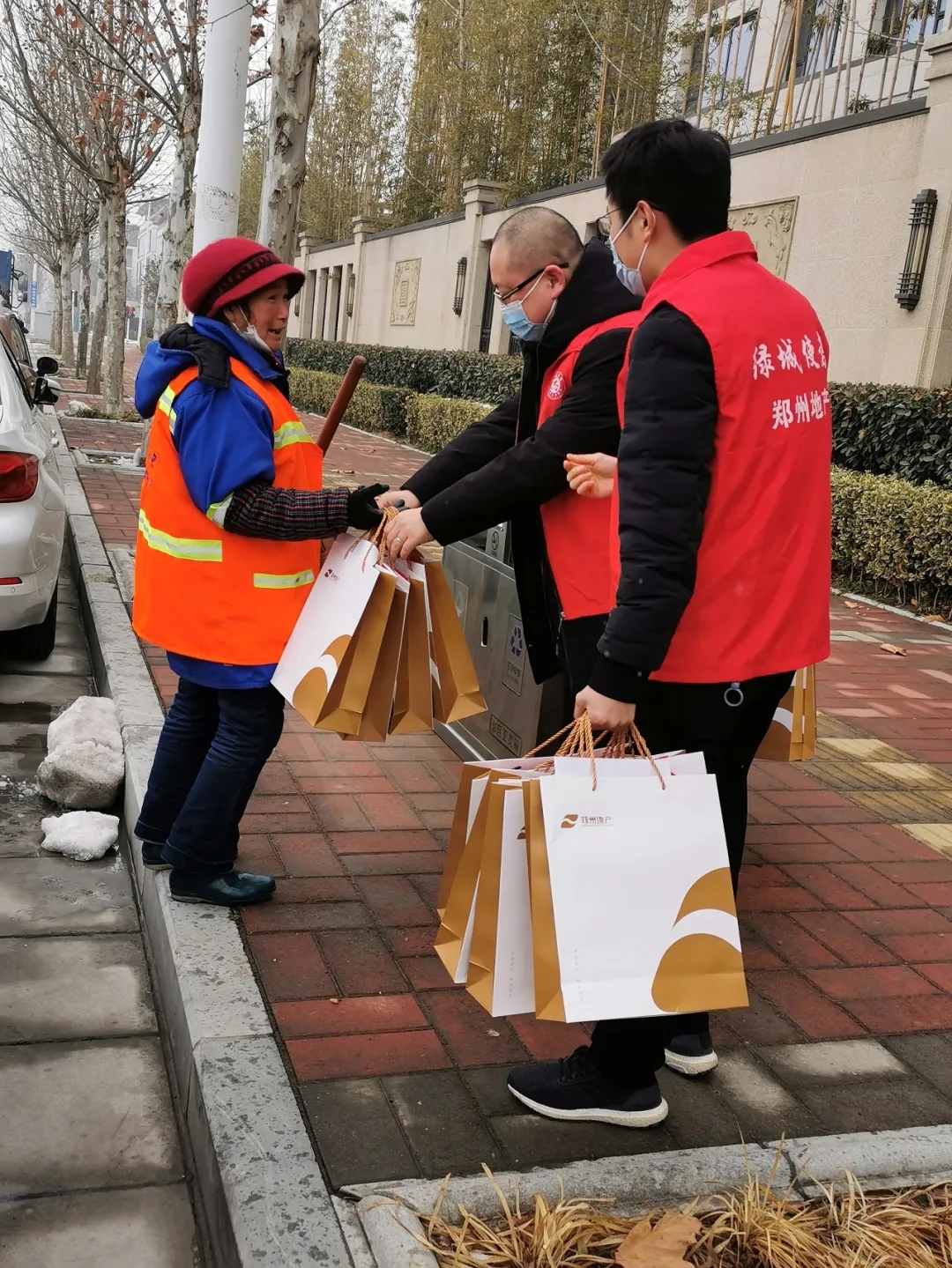 活動(dòng)中黨員同志們先后為市政環(huán)衛(wèi)工人、亞新龍湖壹號(hào)院保潔員及六樓餐廳工作人員贈(zèng)送了春聯(lián)及對(duì)新春美好的祝福,感謝他們?cè)谝咔榉揽仄陂g為大家提供健康舒適辦公環(huán)境及良好的用餐環(huán)境,感謝他們堅(jiān)守一線,為城市干凈優(yōu)美的市容市貌的艱辛付出,并提醒在服務(wù)大家服務(wù)城市的同時(shí)做好個(gè)人防護(hù),注意防寒保暖。一線工作者們紛紛表示送春聯(lián)活動(dòng)讓他們真真切切感受到社會(huì)和企業(yè)對(duì)他們的關(guān)懷和祝福,也為即將到來的春節(jié)增添了濃郁的節(jié)日氣氛。